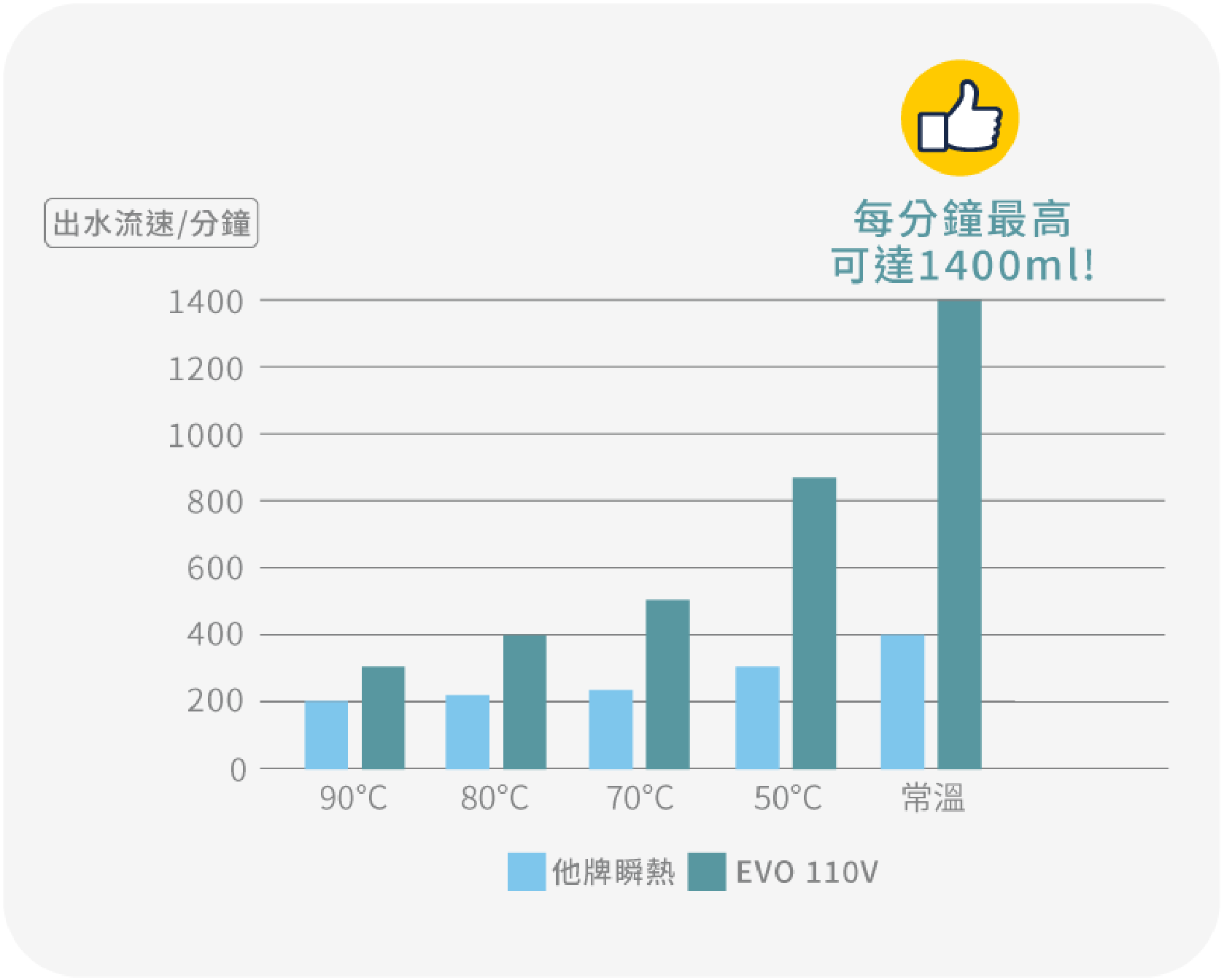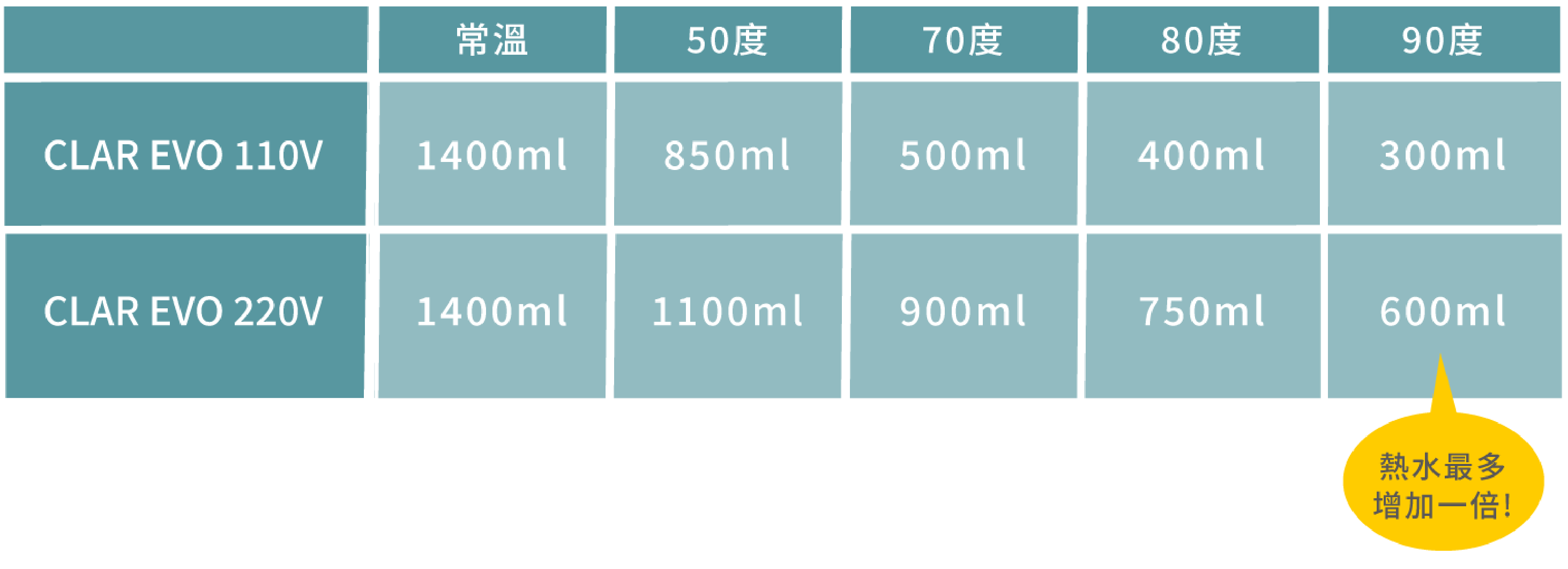 CLAR EVO在不同溫度下,有不同的出水量,每分鐘最高可達1400ml,超越市售瞬熱淨水器兩倍 !